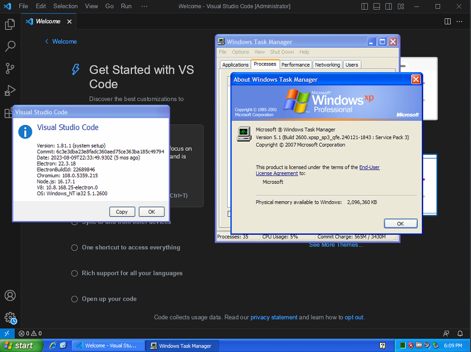 The latest release of Visual Studio Code running on Windows XP Professional. As shown by the about panel: the dependencies Electron, Chromium and Node.js are made functional using the kernel extension.